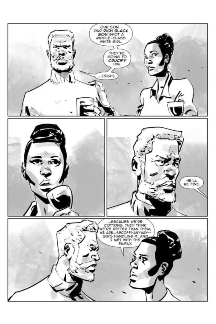 How we see this being told is rather interesting. The story & plot development that we see through how the sequence of events unfold as well as how the reader learns information is presented extremely well. The hospital scene to me could be any rich person versus any middle class, or lower class to lower middle class, family and the problem is many just assume this is how it goes but without being there how do we know? Having never been on either side of the that particular coin I cannot relate to either one, yes I just erased the colour factor. The character development is interesting the Cotton’s feel like a Republican family at least through the attitude and actions of the parents. The pacing is superb and as it takes us through the pages revealing what we need to see and know we start getting glimpses at the bigger picture here.