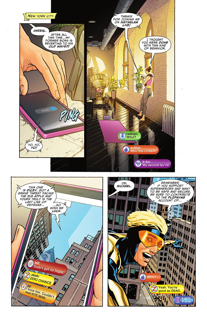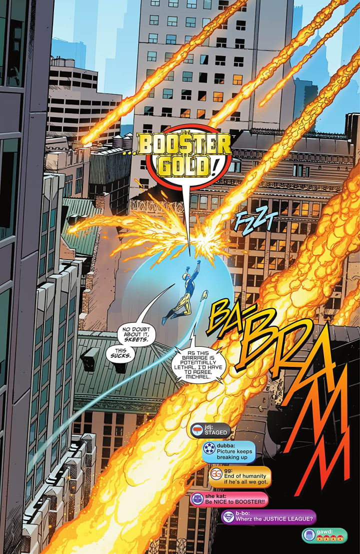 Desperate to regain the spotlight, Booster Gold looks to attract the public’s (and Justice League’s) attention the same way any washed-up, second-rate hero would-social media. The not-so-tech-savvy hero from the 25th century enlists the help of his best friend, Blue Beetle, who possesses both the money and the brains to help his old pal navigate the scary world of internet influencers. Watch out, evildoers, our heroes are live and online!