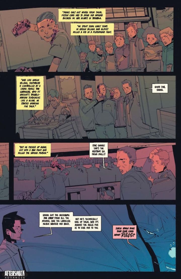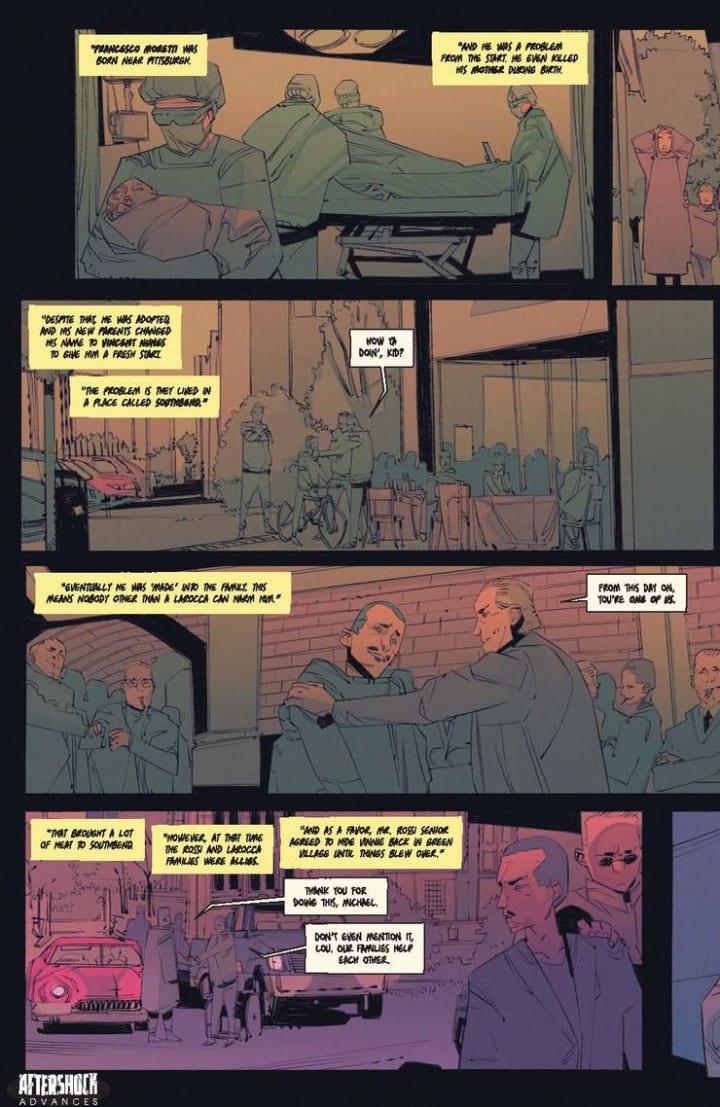 Sonny is the guy everyone knows and likes in the neighbourhood. He’s genuine, grew up there and honestly cares about those who live there and he’ll do whatever he can to keep them safe. The problem is he’s young, full of ideas and not a hard man so he tends to get pushed around by those he works for. He’s the epitome of the small town hero, yes the burrough of New York of any major city for that matter can be seen as a small town. With some spectacular writing and perfect characterisation alongside these notable interiors we really see his world brought to life.