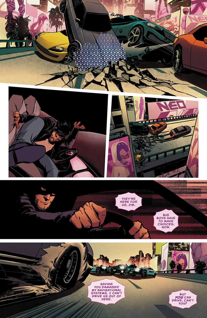 The interiors here are fantastic. How we see the linework with its varying weights and techniques being utilised to create the detail work is amazing stuff. There are some real wow moments here like seeing the computer generated grid pattern on the car and basically every time we Gillian. I do wish we’d see a lot more backgrounds in use, still we get some beautiful depth perception, sense of scale and that overall sense of size and scope to the story. The utilisation of the page layouts and how we see the angles and perspective in the panels show such a marvellous eye for storytelling. The colour work is exceptionally well rendered. How we see the various hues and tones within the colours being utilised to create the shading, highlights and shadow work is great stuff.