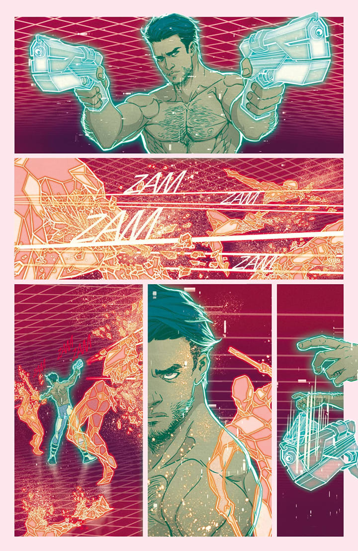 I am a fan of the interiors here. The linework is fantastic and I think I may be super impressed with the coloured linework as well as seen from inside Gillian’s world. I love the fact that Jim has a hairy chest that leaves me chuffed to bits. How we see the attention to detail through the varying weights and techniques is really well rendered. I’d like to see more backgrounds but I get the whole inside the car where it’s not exactly conducive to that still we get some great depth perception, sense of scale and the overall sense of size and scope to the story. The utilisation of the page layouts and how we see the angles and perspective in the panels show a marvellous eye for storytelling. The colour work is brilliantly rendered. The various hues and tones within the colours being utilised to create the shading, highlights and shadow work shows a great understanding of how colour works.
