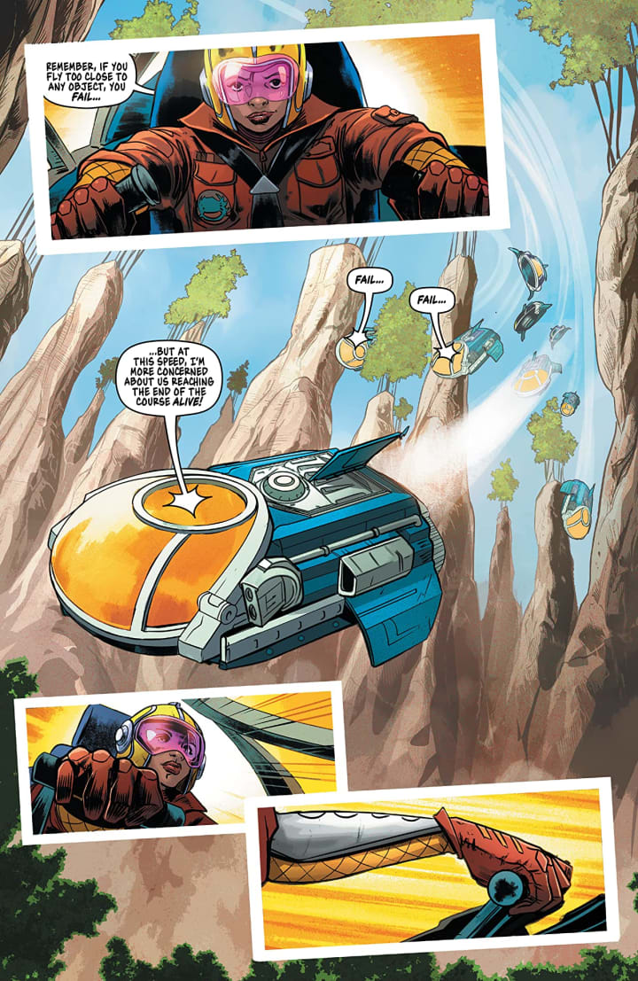 The interiors here are a very strong classic comic book style and they take this science fiction drama to that place it needs it to be. The linework is clean, crisp and strong and the varying weights and techniques being utilised to create the level & quality in the detail work that we see is magnificent. The faces and facial expressions really do wonders in furthering the characterisation. The way backgrounds are being utilised to expand and enhance the moments is fantastic. How we see them work within the composition of the panels to bring out the depth perception, sense of scale and the overall sense of size and scope to the story is great. The utilisation of the page layouts and how we see the angles and perspective in the panels show a remarkably talented eye for storytelling. The various hues and tones within the colours being utilised to create the shading, highlights and shadow work show a sensational eye for how colour works.