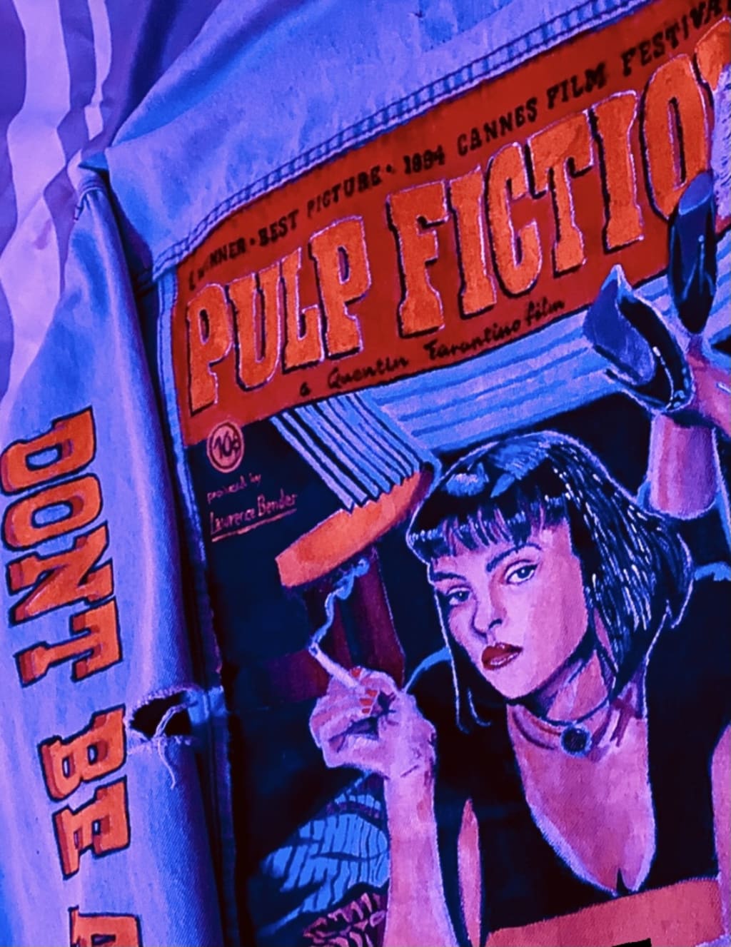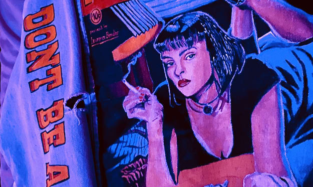 I began with one of my favorite films of all time, Pulp Fiction, directed by the legendary Quentin Tarentino. First, I gave my denim jacket a wash and hung it to dry for a couple of days. Then, I used acrylic gesso to prime and cover the back of the jacket. Upon the gesso fully drying, I would then sketch out the movie cover with a soft charcoal pencil. This would ease the task of painting the figure, background, title, and any of the contents of the movie cover. The most challenging part about sketching the entirety of the movie cover was making sure that Uma Thurman's character (Mia) was drawn to accurate proportions. Within the same session of applying gesso and sketching the cover, I would then mix my acrylic paints with a fabric medium developed by Liquitex. I wanted to be as accurate and precise with the ratio of fabric medium mixed with the acrylics. The most luxurious thing about using the fabric medium was the fact that it did NOT require the fabric to be heat-pressed. I could not ask for anything more convenient in the process of creating my masterpiece. I was able to establish an accurate depiction of the color scheme as a result. Next, I began painting the Pulp Fiction movie title. As I finished the movie title, I began to transition to Mia's face, as well as the background of the poster. After I've completely covered the gesso-applied 'canvas' of the jacket, I began detailing the objects and Mia upon 'fleshing' everything out. Then, I revisited the film in search of a line or quote to add to my denim jacket. I devised a change of scenery/location to paint this quote for the jacket. I've decided to paint the movie quote, "Don't be a Square." on the left sleeve of my jacket. The intent of this was to give the jacket a renewed sense of depth and versatility. This allowed friends, peers, or whoever would see it, to view the jacket in its totality instead of just focusing on the main painting in the back. Finally, it was time to put my embroidery skills to the test. Instead of shelling out $400+ on my first denim jacket prototype, I still wanted to experiment before making this a full-scale commitment during quarantine. I began the embroidery process by purchasing needles and thread to start making the logo around the front of the denim jacket. I decided to stay committed to the true color scheme of the logo and typography of the 'Pulp Fiction' branding.