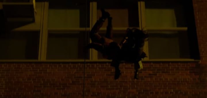 Also, towards the end of trailer number two we see him diving off a building as he holds onto some form of rope. Admittedly, it could have possibly been left behind by those dodgy-looking dudes climbing up a building earlier on, yet in the first trailer, we saw The Man without Fear brandishing a chain as a weapon.