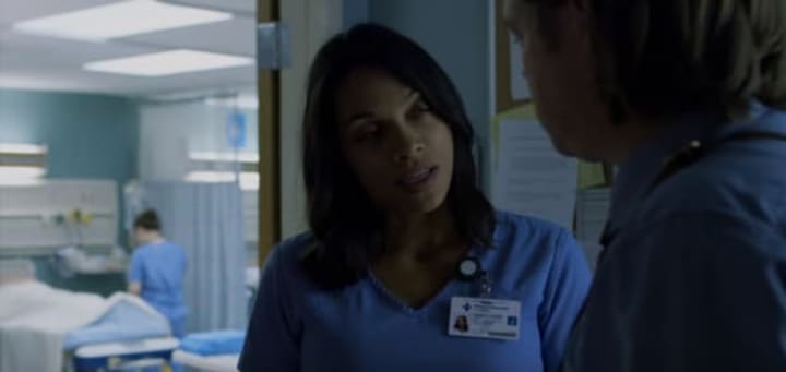 She appears in both trailers, talking to Foggy Nelson (Elden Henson) in a hospital ward (Metro-General perhaps?) in the first trailer and Matt in the second.