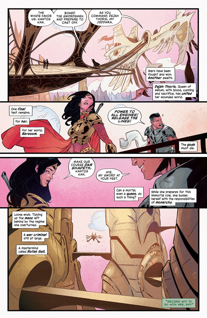 Colour me intrigued that’s for sure. While I’m not a big fan of self-pity I do understand John’s lack of confidence at the moment. Though he needs to get over that and work on his self esteem and talk to the woman he loves instead of running away. Meanwhile he is right about one thing Dejah is a strong willed, independent and highly capable woman, Queen or no. So much so that she too at times fails to remember that there are those around her who would do anything to keep her alive, protect her and shield her from danger though loathe as she is to admit that not fighting head on is not a sign of weakness we fully understand her position and where she comes from as well. Dan is good at bringing us into the story so we’re engaged and invested in a short amount of time.