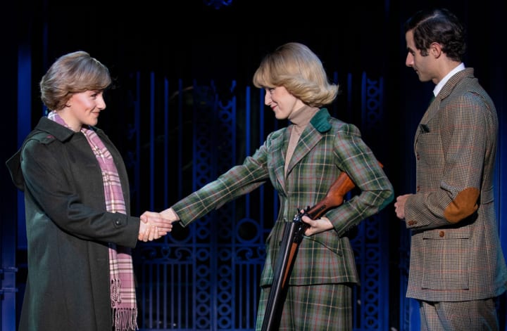 The show stars Jeanna de Waal as Diana, Roe Hartrampf as Prince Charles, Erin Davie as Camilla Parker Bowles, and Judy Kaye as Queen Elizabeth. I feel a little bit bad for the actors involved in this because they’re doing a decent job with what they’ve been given. It can’t be fun being part of a musical which is getting so much negative press before it’s even opened on Broadway. None of the portrayals are particularly accurate but if you ignore that fact, the cast themselves are charming enough and vocally talented. By far the most (unintentionally?? I can’t even tell!) hilarious portrayal is that of Queen Elizabeth (Broadway veteran Judy Kaye) who is an absolute caricature. I don’t think we can blame the actress - her lines and musical numbers are kind of ridiculous. She acts and sounds exactly like a stock queen from an animated movie. All of those films over the years that have included somewhat satirised versions of Elizabeth as a character, such as "Minions" and "The BFG"? That’s what this queen is like. For pity’s sake, at one point she talks about herself in the third person during a song, proclaiming (to the sound of yet another bouncy tune) that “her majesty is in distress, this travesty she must address”. Come on! Then right after that she gets to sing what is supposed to be a touching ballad called “An Officer’s Wife” about her happy times with her husband before she had to be queen. The effect is, to put it mildly, comedic, and the chorus marching behind her, dressed in uniforms, with utterly unearned pathos doesn’t help matters. What I was a bit surprised by is that, despite being too cartoony, this is a rather kind portrayal of the monarch. She comes off as witty and ultimately benevolent. I find it hard to believe her relationship with Diana was this amicable or that she was so understanding.