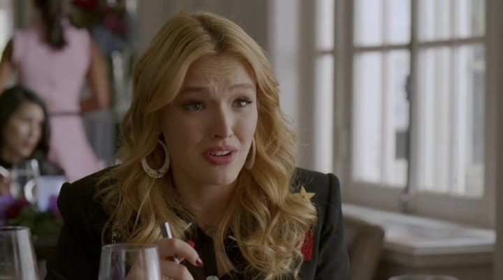 We are introduced to the family as Fallon is pining for the role of CFO in her father's dynasty, Carrington Atlantic. It's an oil company or something like that. I don't know. Her hair is too perfect. It's distracting.