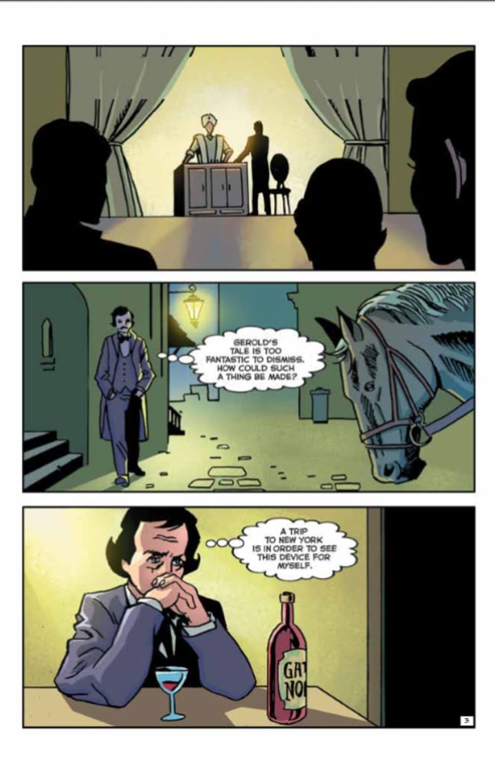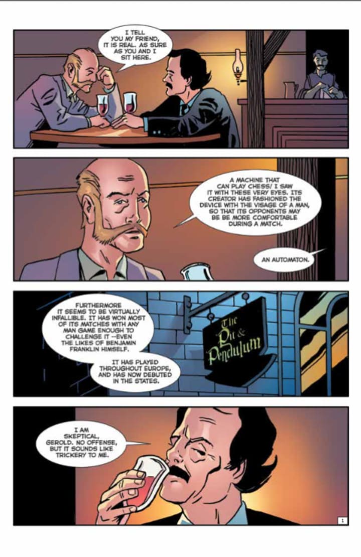 Before I get into the review, can I just say that the title for the first story is amazing, the lettering in that Hebrew style script really caught my attention and made me smile. I am consistently awed by these odd little stories. What I adore about the first one is it made me want to know about Automaton’s and when they were first created. We are constantly taken off the page with these stories thus being engaged in ways that entertain, make us question and educate us. Not so ironic considering in school we learn about Poe and his writings so it seems that even now he continues to teach us and I find that quite glorious.