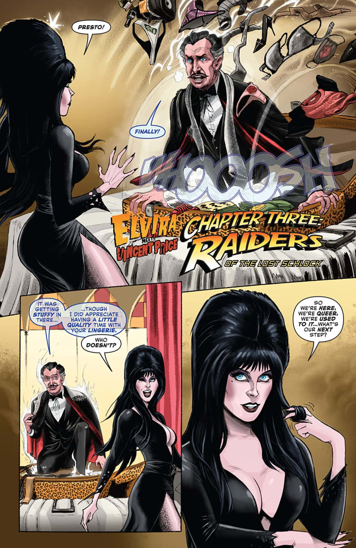Elvira and Vincent’s Ghost arrive in Cairo, hot on the trail of the missing movie that can save the world from Amun-Ra! It’s a game of cat-and-mouse among the pyramids, as a pair of silent comedy assassins stalk Elvira and Vincent, ancient crypts are infiltrated, angry goddesses are awakened, and tourists are confused… in a story we call “Raiders of the Lost Schlock!” Adventure, horror, and temples of doom but no crystal skulls, we promise…
