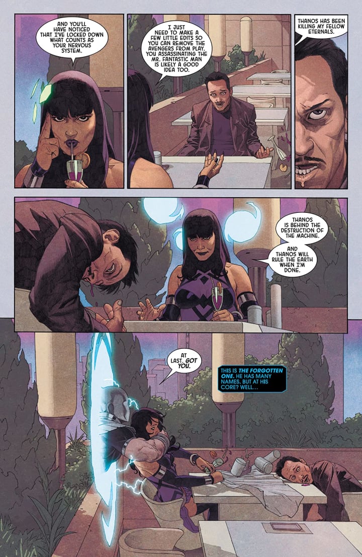 This really is one of the best series Marvel is putting out right now. It has some of the most amazingly intelligent storytelling that I have had the pleasure to witness in quite some time. Whether or not Sersi is even remotely telling the truth or not doesn’t make one lick of difference she’s such a ferocious woman and with her time as an Avenger showing us she will do whatever makes her feel good in that moment as taking Dane for a husband showed us. To see her being fully unleashed and uninhibited as Kieron lets her be within these pages is simply stunning. She is also a smart cookie as she removed any trace of Thanos from her conversation with Tony proves. So while all the Eternals have their talents there are few as intimidating as Sersi truly is whether her fellow Eternals admit this or not.