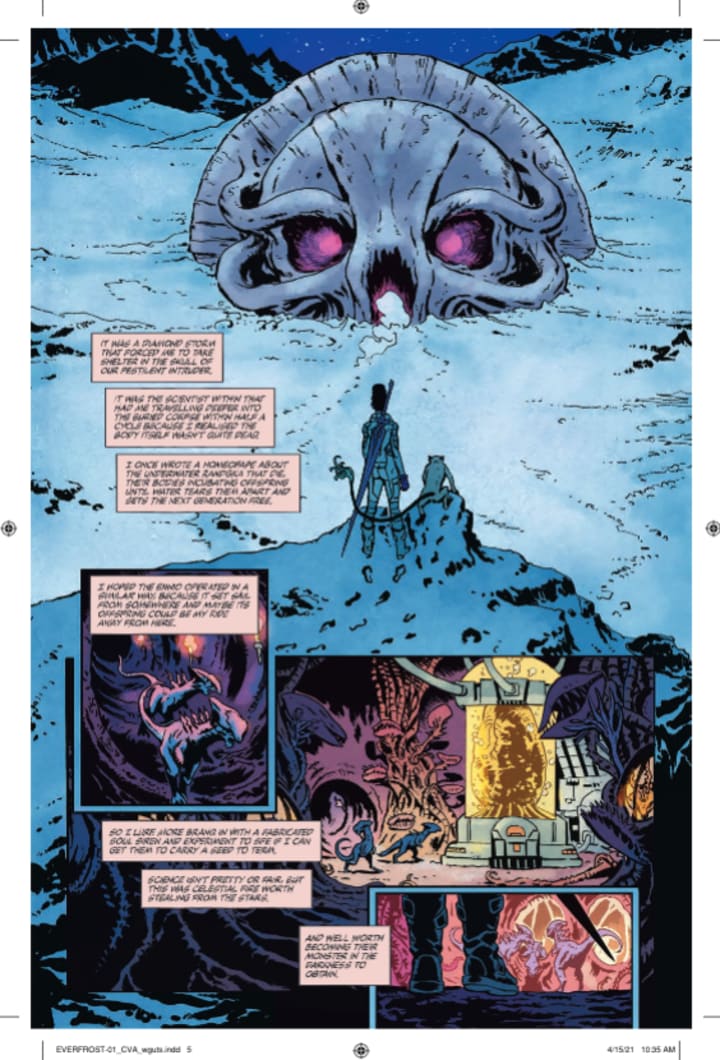 I’m digging the interiors here. The linework is sensational and how we see the varying weights and techniques being utilised to create the detail work is astonishing. This also leads into the creativity and imagination that we see as well. Some of the creatures we see are familiar and feel like offshoots of animals we know or have existed and others are simply fantastical. Regardless it really adds this something special to how we see the story. Backgrounds are utilised extremely well throughout the book and how they work within the composition of the panels bringing us depth perception, a sense of scale and that overall sense of size and scope to the book is great to see. The utilisation of the page layouts and how we see the angles and perspective in the panels show a marvellously talented eye for storytelling. The colour work is brilliantly rendered as well. How the various hues and tones within the colours being utilised to create the shading, highlights and shadow work shows a brilliant eye for colour and how to make it work effective, interestingly and spectacularly well.