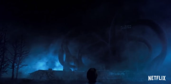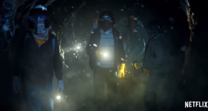 Hopper is not the only one traveling to the Upside Down. A brief shot of Mike Wheeler and his friends depicts them stepping through a cave's opening that is covered in tentacle-like growths.