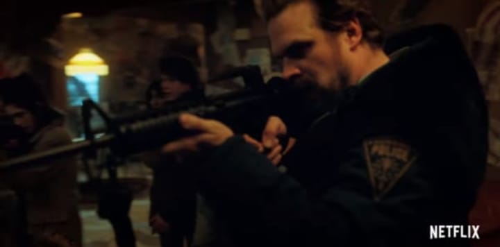 Hopper throws a rifle to Nancy Wheeler, and he holds one himself. The rest of the gang seem to be bracing for an attack as well. We don't know what they're looking at, but their reaction tells us that danger is approaching.