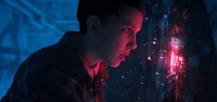 The previous trailer showed her in the parallel world, touching some kind of energy bursts. No one knew what that scene meant — but her lack of hair in the image below leads me to believe that she'll remain with the Upside Down for a substantial span of time.