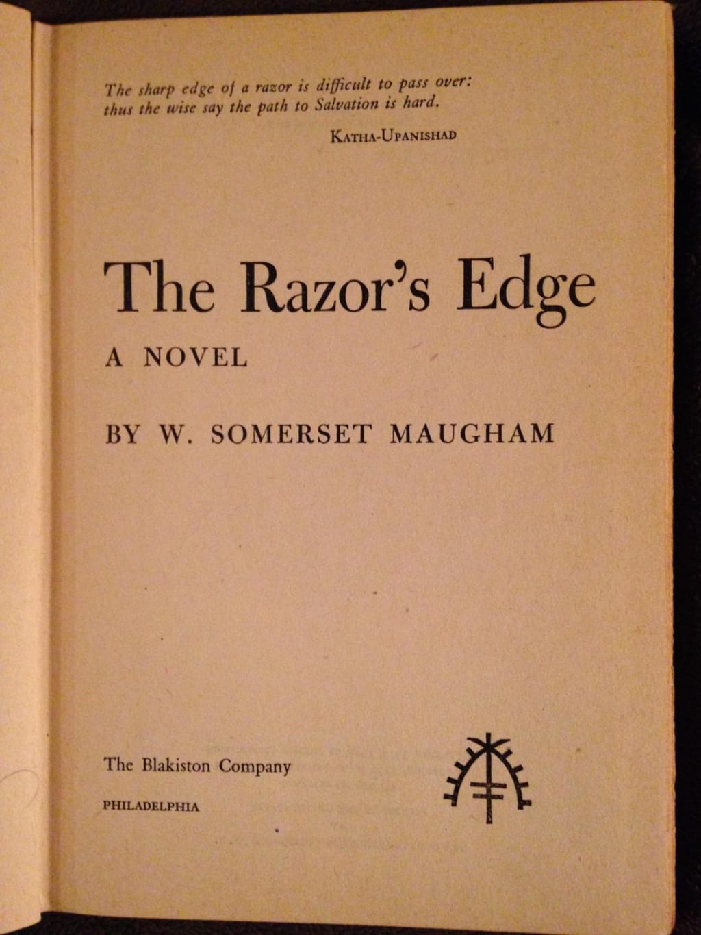 The first chapter of my experience with the novel The Razor's Edge, by W. Somerset Maugham begins in a GOODWILL. A stack of vintage bound five-dollar books the height of one of my friends sat clustered next to the front register. A little blue book with aged pages, and a small gold symbol edged onto the front cover caught my eye. I observed it. I inspected the spine to uncover the title and author, as well as feeling the soft parchment between my fingers. With no summary provided, I opened it to the first chapter: the very first sentence, a first-person telling by the author filled with comedy and philosophic tragedy. I was hooked, paid the five dollars, and attempted to read more while I sat in the backseat of my friends' car, and we all drove about the dark San Francisco streets. I was enthralled, but because of my studies, I had to set it aside.