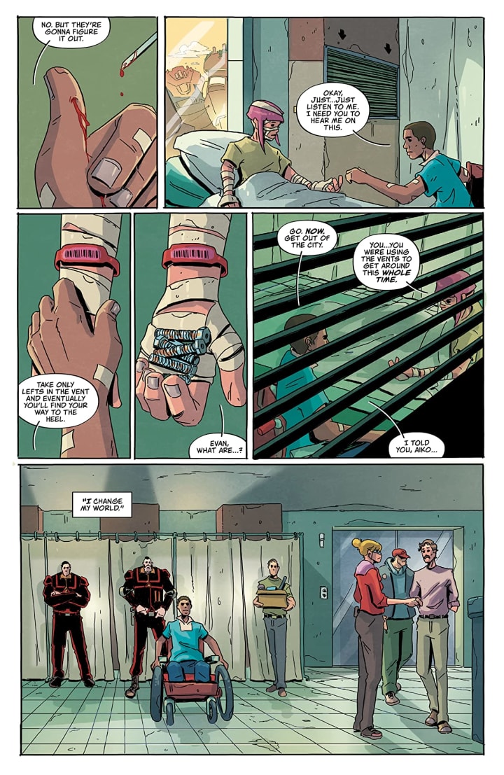 Well this issue certainly has it all that’s for sure. Secrets, lies, manipulation and intrigue all surround one characters actions both in the past and present and it could spell complete and total upheaval for the world as Evan knows it. Is there anything he can do? Not likely but knowing this brave young man he’ll try something and I cannot wait to see what that will be. I love what Alex is doing with this story, he brought Aiko back into his life after such a long time and she’s not the same person she used to be as she’s so much worse. This is what happens when friends lose touch, sometimes you can pick up right where you left off other times its like you never knew them at all and unfortunately this is the latter. That Alex engages the reader in such a strong and familiar way, familiar to everyone, is a testament to his skill and talent.