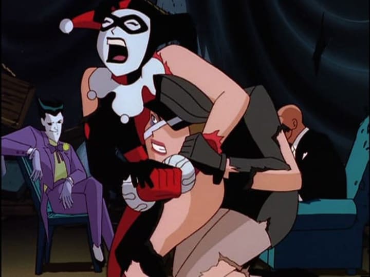 The #DCAU portrays a strange version of Harley; she's clearly a tragic character, locked in an abusive relationship by her desperate love for the Clown Prince of Crime. As many have commented recently, the #Joker and Harley are most definitely not #RelationshipGoals. Mad Love alone makes that clear; the story climaxes with the Joker tossing Harley out of a window. Committed to Arkham, Harley decides that it's time to get back on her feet, to leave the Joker once and for all.