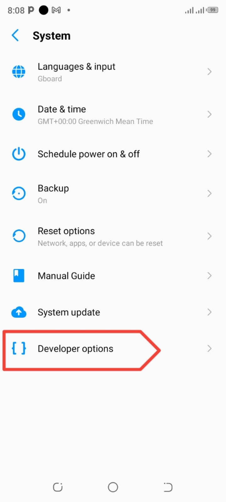 5. Return to the previous screen to find Developer options at the bottom. On other device, you may need to scrowdown and tab on System and scrowdown to Developer options at the bottom.