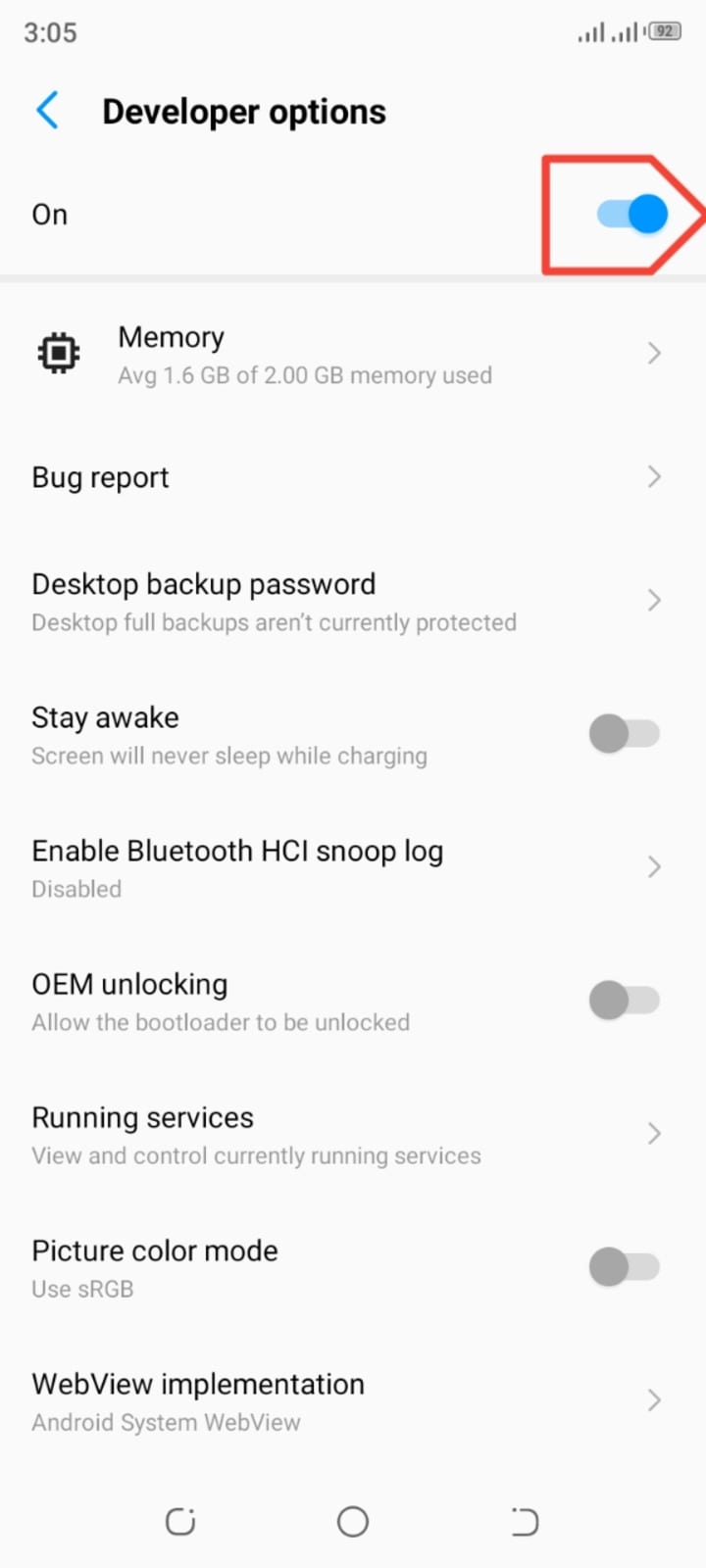 6. You can toggle the settings on and off at the top of the Developer options screen.