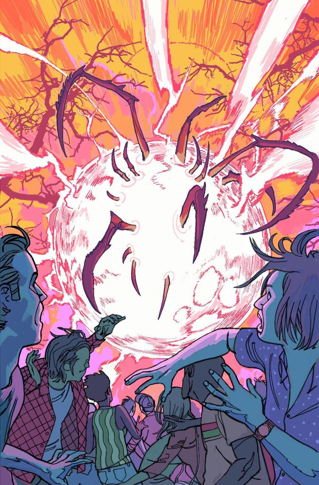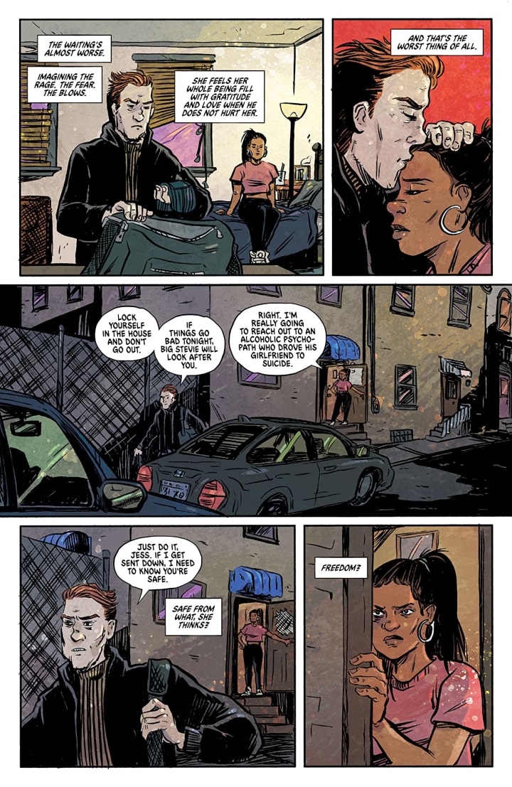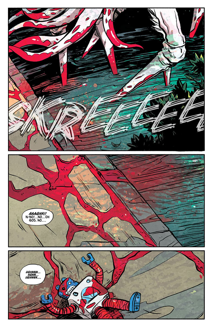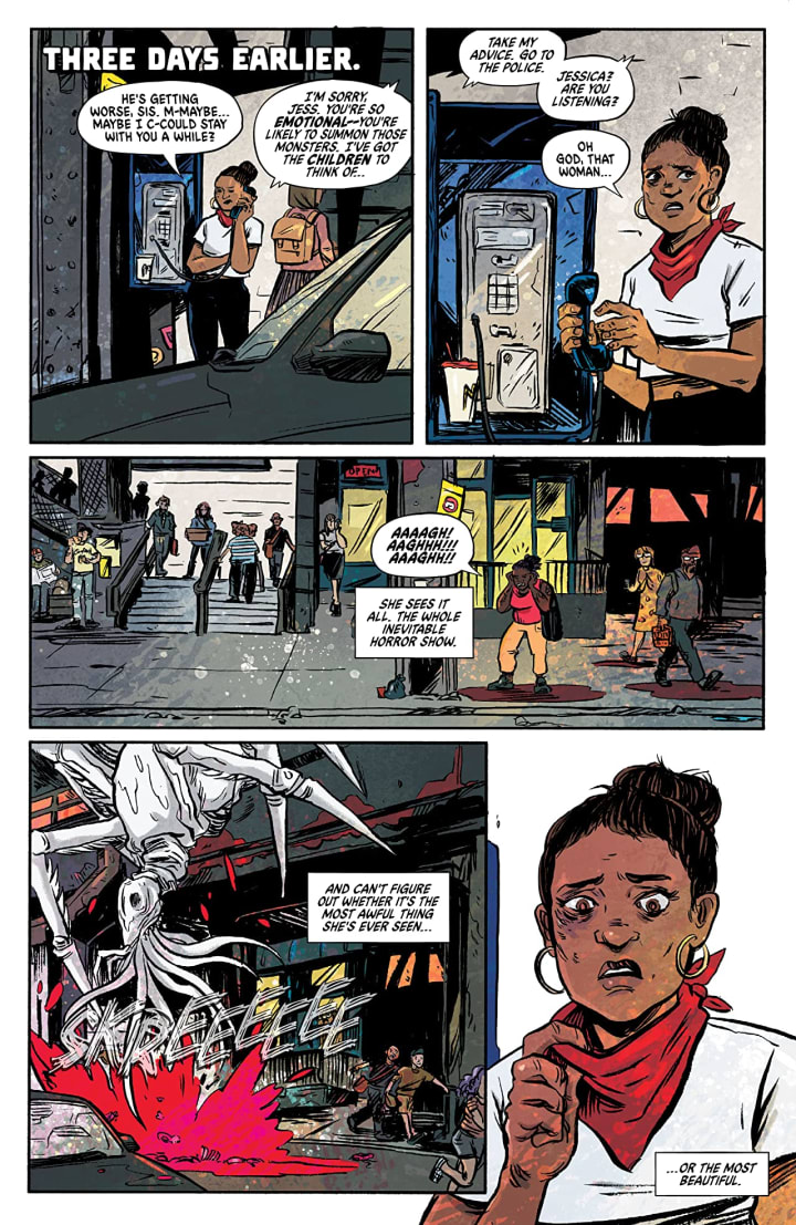 I wish that these creatures were a lot more menacing looking but I do appreciate the way that we see bits and pieces of them as they go about their business so that the readers’ minds get to expand those moments which is always more terrifying than we actually see. How we see the backgrounds being utilised to enhance and expand the moments as well as how they work within the composition of the panels to bring out the depth perception, sense of scale and the overall sense of size and scope to the story. The utilisation of the page layouts and how we see the angles and perspective in the panels show a very talented eye for storytelling. The various hues and tones within the colours being utilised to create the shading, highlights and shadow work shows such a great understanding of how colour works.