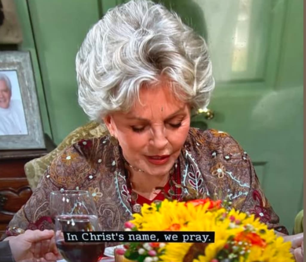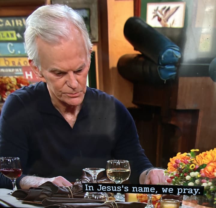 The scene shifted to Roman Brady (Josh Taylor), who opened his holiday prayer by saying Lord Jesus. He closed his prayer with "In Jesus Name." On Friday, Julie Williams (Susan Seaforth Hayes) ended her Thanksgiving prayer with "In Christ's Name."