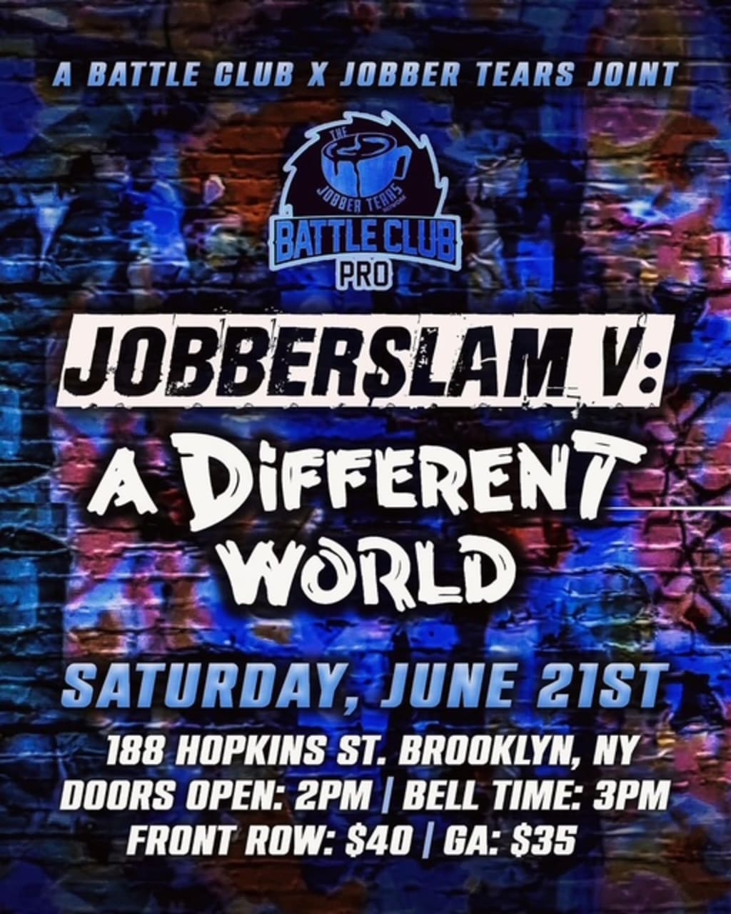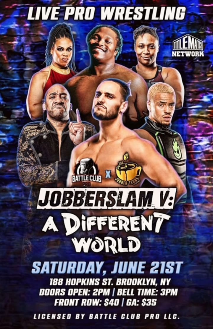 BROOKLYN, NY — The heartbeat of independent wrestling is pounding louder than ever, and it’s all leading to SATURDAY, JUNE 21ST, when JOBBERSLAM V takes over 188 Hopkins St. in Brooklyn! Doors swing open at 2 PM, the bell rings at 3 PM, and if you think you’ve seen explosive action before — think again. This isn’t just another show. This is THE event that’s redefining what it means to be a wrestling fan in NYC. The event is presented by Jobbertears Podcast Network and Battle Club Pro .