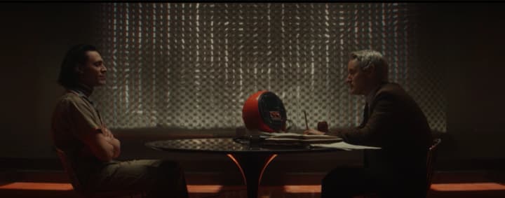 The scene tenses as Mobius plays Loki’s cinematic life on a holographic screen—Loki is visibly upset by his mother Frigga’s prospective death at his hands as evidenced by the clip.