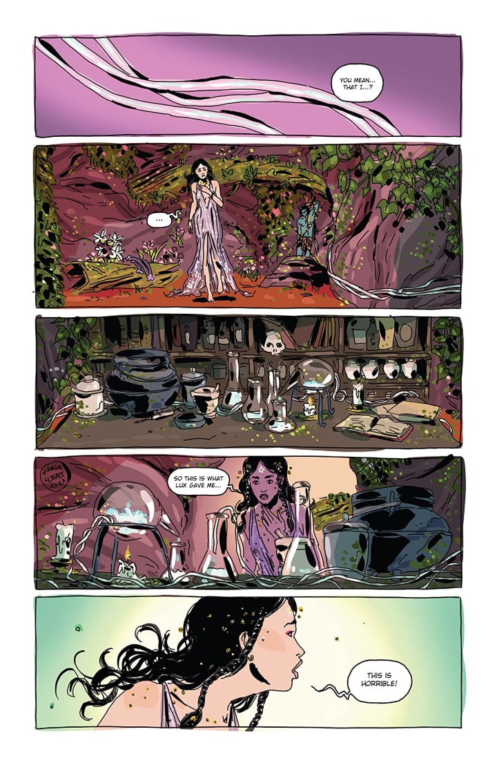 The interiors here a modern interpretation of the sixties kind of psychedelic phase. There is some absolutely stunning imagery that’s incredibly tasteful and yet evocative to the point of no return at the same time. Normally I would be talking about backgrounds and how they are needed but not here, there’s a way that we see the composition within the panels that make it feel filled up when the reality is there is plenty of open space. I cannot rave enough about Maria’s talent, skill and her uniqueness in being able to do what she does. The utilisation of the page layouts and how we see the angles and perspective in the panels show such a remarkably talented eye for storytelling. The colour work is divine. How we se the various hues and tones within the colours being utilised to create the shading, highlights and shadow work is breathtaking. The choices of colour we see can range from the mundane to the extraordinary and how it mixes and matches throughout is mind numbing.