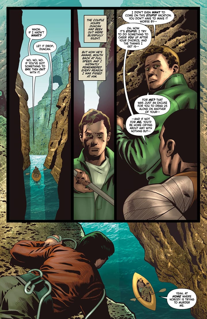 Well Victor certainly sent me for a loop with this issue. I mean it starts off beautifully with these folks in search of the missing group of friends. By the time we get to the last page what Victor puts us through is a real tour de farce and it just takes the reader by complete and total surprise. That’s as much as i’m giving you, so you’ll have to read the book to find out what exactly I am referring to but suffice it to say it damn near changes how you view the story in its entirety. The locals who have been chasing the group have a very definite Deliverance feel to them and it’s both spot on and absolutely terrifying at the same time.