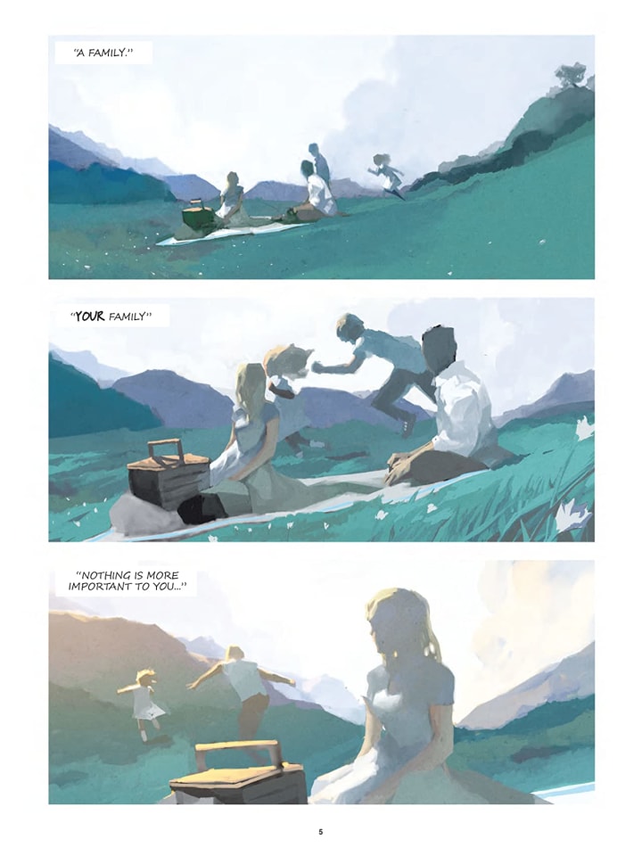 I am loving every moment of the interiors here. This is done in such a non-traditional way so that it feels like it’s being painted and that is how the attention to detail comes about. The change in colour and how shadow work is shown through the various hues and tones is done so it feels like there is no linework. It blows me away that everything feels like it done solely through painting colours on a canvas. The utilisation of the page layouts and how we see the angles and perspective in the panels demonstrate a masters eye for storytelling. The work that we see is bloody mindbogglingly brilliant to look at and you will simply stare it trying to figure out just how all this detail work has been created.