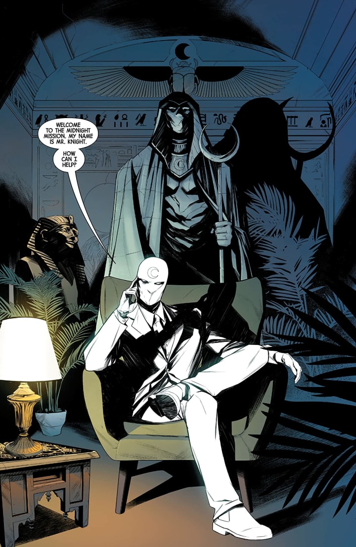 The mysterious Mr. Knight has opened his Midnight Mission, his people petitioning for protection from the weird and horrible. The Moon Knight stalks the rooftops and alleys marked with his crescent moon tag, bringing violence to any who would harm his people. Marc Spector, in whichever guise he dons, is back on the streets, a renegade priest of an unworthy god. But while Khonshu languishes in a prison that Moon Knight put him in, Moon Knight must still observe his duty: protecting those who travel at night. Let it be known – Moon Knight will keep the faith.