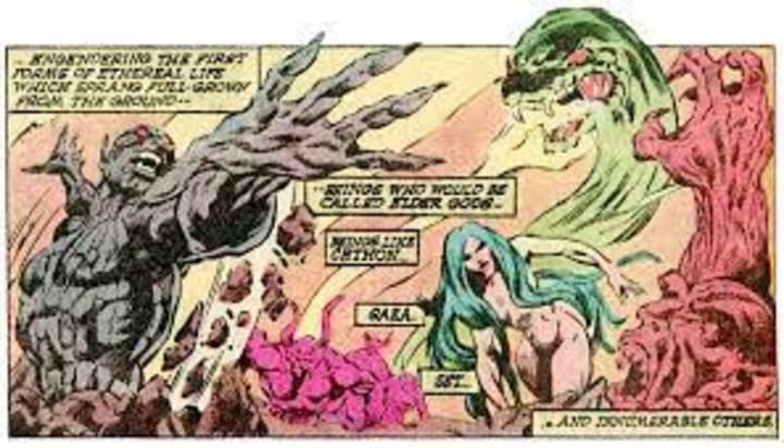 In the Marvel Comics version of Earth's history, the sentient life-force of the Earth's bio-sphere, known as the Demiurge, created the Elder Gods soon after the planet's birth. The most notable among them were Chthon and his siblings, Set, Oshtur, and Gaea. While Oshtur departed relatively early to explore other worlds, the rest of the Elder Gods ruled over Earth for millions of years. During this time, Chthon studied mystical forces and became the Earth's first Black Mage. At some point, he created the Other Realm, a world of his own to occasionally escape to.