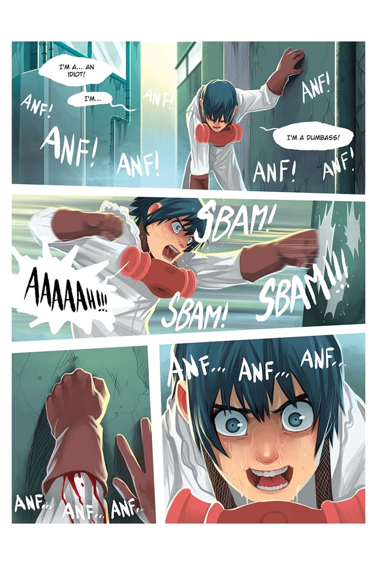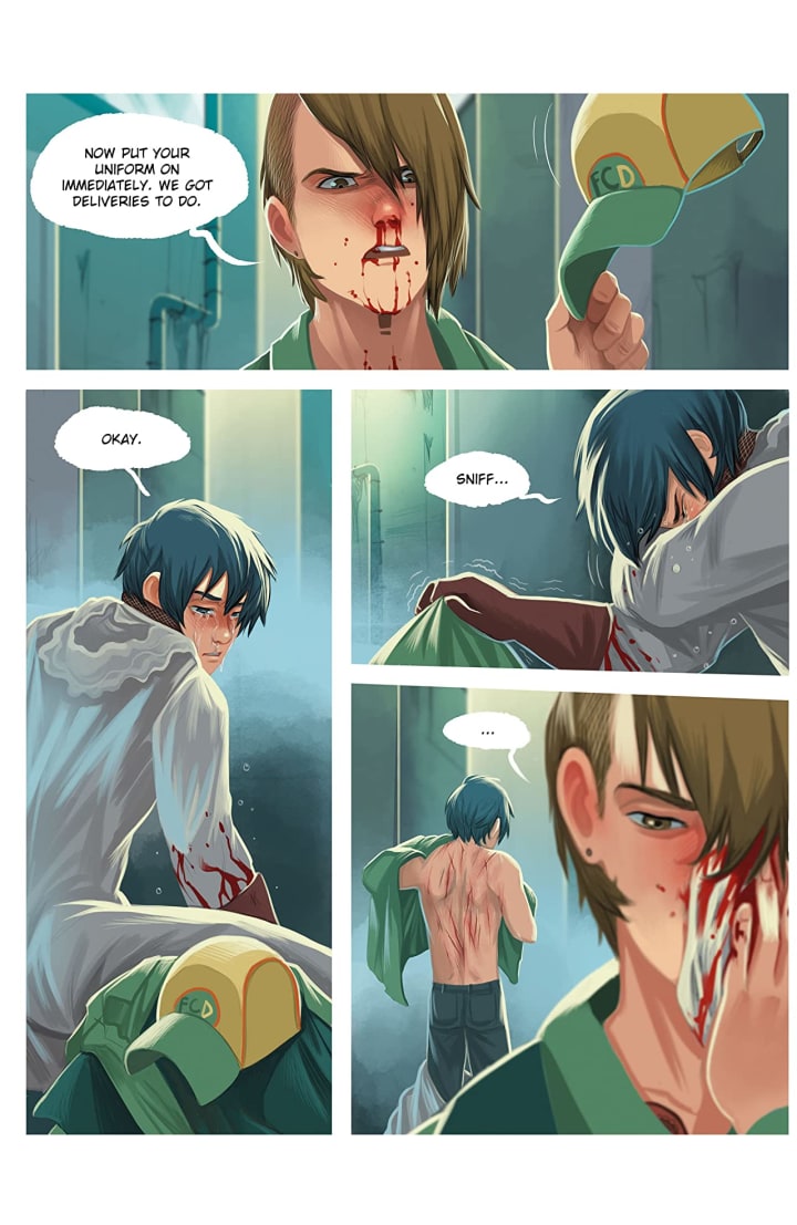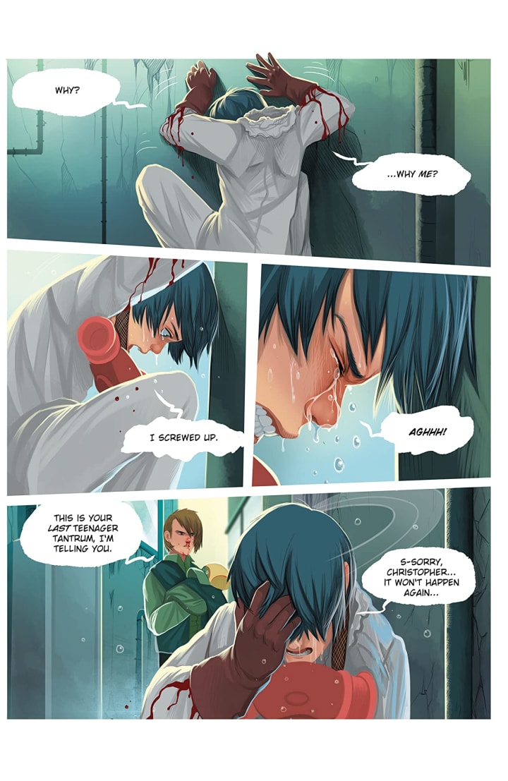 The interiors here have this whole idea of Americanised Manga to me, so that blend of manga and traditional comic book style that creates a much lighter than expected tone. I like it, mind you it really shows a contrast between the words and actions and it draws the reader into those darker moments more fully. How we see the composition of the panels being utilised to bring out the depth perception, sense of scale and that overall sense of size and scope to the story is beautifully handled. The utilisation of the page layouts and how we see the angles and perspective in the panels show a remarkably talented eye for storytelling. The various hues and tones within the colours being utilised to create the shading, highlights and shadow work shows a fantastic eye for how colour works.