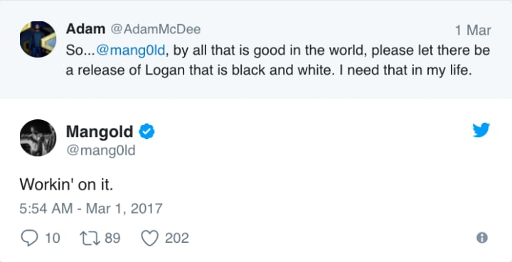 Before Logan had even reached cinemas, one uber-fan took to Twitter to ask Mangold if there would be a black and white version. The director simply replied "Workin' on it," but all has been quiet since.