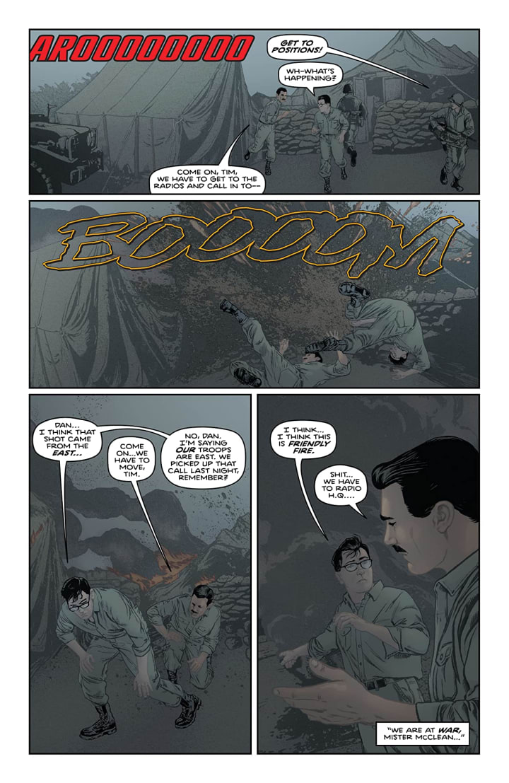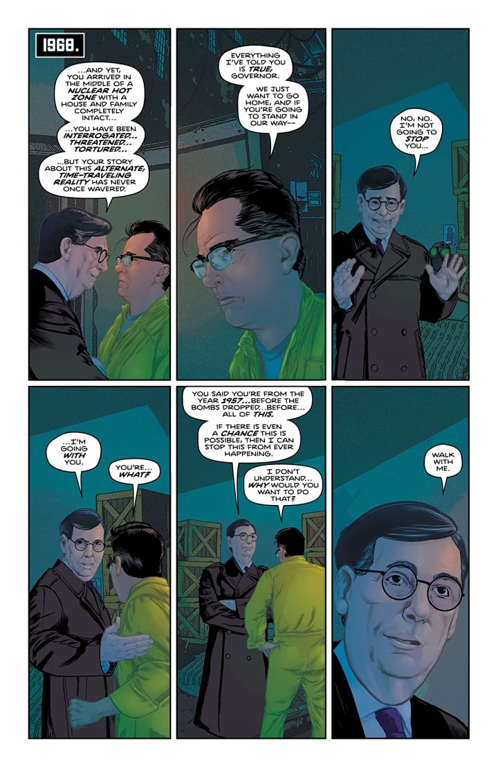 There is something about the way that this ends that was a little disappointing to me. I think I’d have preferred to see the Boom than the black and left it there leaving the reader to wonder whether or not it worked. I think that would have been a far more effective ending than tying it up with a pretty little bow. Again this is just my opinion. I did find it interesting to open this issue in Korea and seeing Tim playing with the radio as it sets us why he had the radio system in his basement. Now seeing the Governor who appears to be a young Mitch McConnell, yuck, was another interesting bit seeing as how he was willing to believe Tim and take him home in the attempt for him to make it back to his time and set things right. Though how exactly that is supposed to work is beyond me.