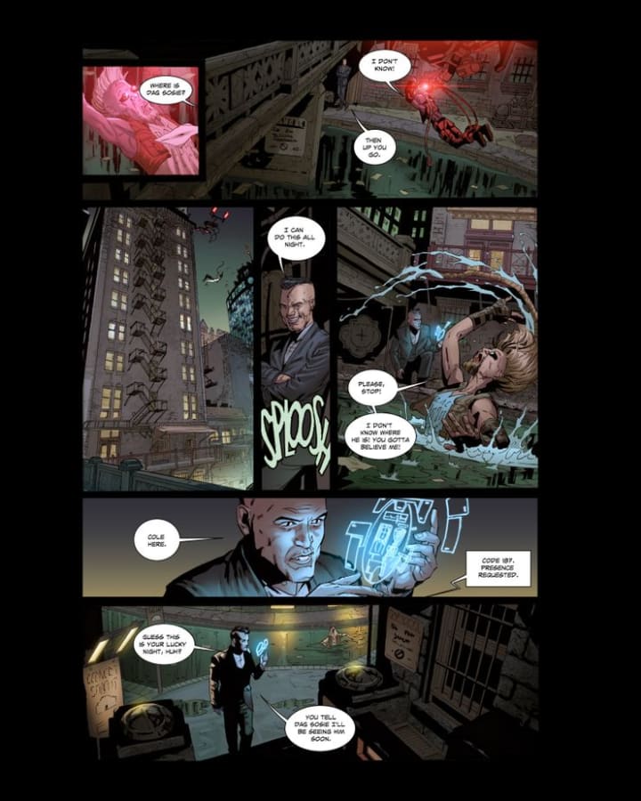 The opening here really struck me with two items, one is how damn beautiful the interiors are and second that detective Cole is a complete and utter asshole. The whole idea of a cop abusing their power to get answers is a tad different than seeing someone like Batman doing it and why that is I’m not entirely sure. So right away the story engages the reader beautifully and as you get further and further in the more you want to see and know.
