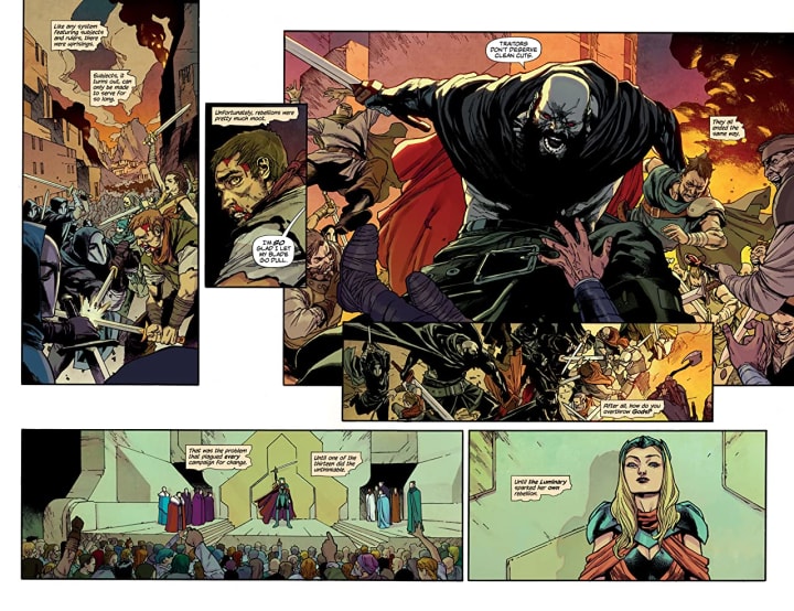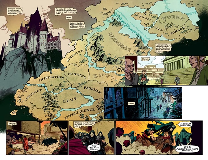 I rather like the interiors here as well. There’s something about seeing sections that are done in different styles to depict the mood and emotions or feeling that go with certain kingdoms. It’s nice to see this kind of versatility in an artist and being able to make them so recognisable. The linework is fantastic and how we see the varying weights and techniques being utilised to bring out the detail work is marvellous. The utilisation of the page layouts and how we see the angles and perspective in the panels show a remarkably talented eye for storytelling. I do wish we’d see more backgrounds being utilised but still we get nice depth perception, a sense of scale and the overall sense of size and scope to the story through the composition in the panels. The colour work is brilliantly rendered as well. The various hues and tones within the colours being utilised to create the shading, highlights and shadow work are impeccably rendered.
