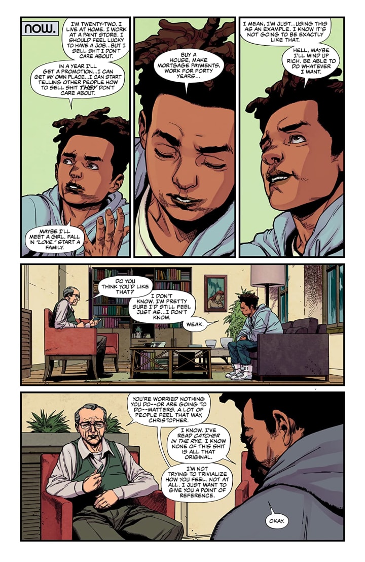 I like the ideas presented in this issue and it’ll be interesting to learn why he was seeing who he was and what he did to see him in the first place, I get what happened just not the specifics and it’s those make all the difference in the world. Also would it be because of who Christopher is that he attempted something? Guess we’ll have to wait and find out. This really is a fabulously written story with stellar characterisation and brilliantly dynamic interiors so with this level of storytelling I can wait to see how the story plays itself out.