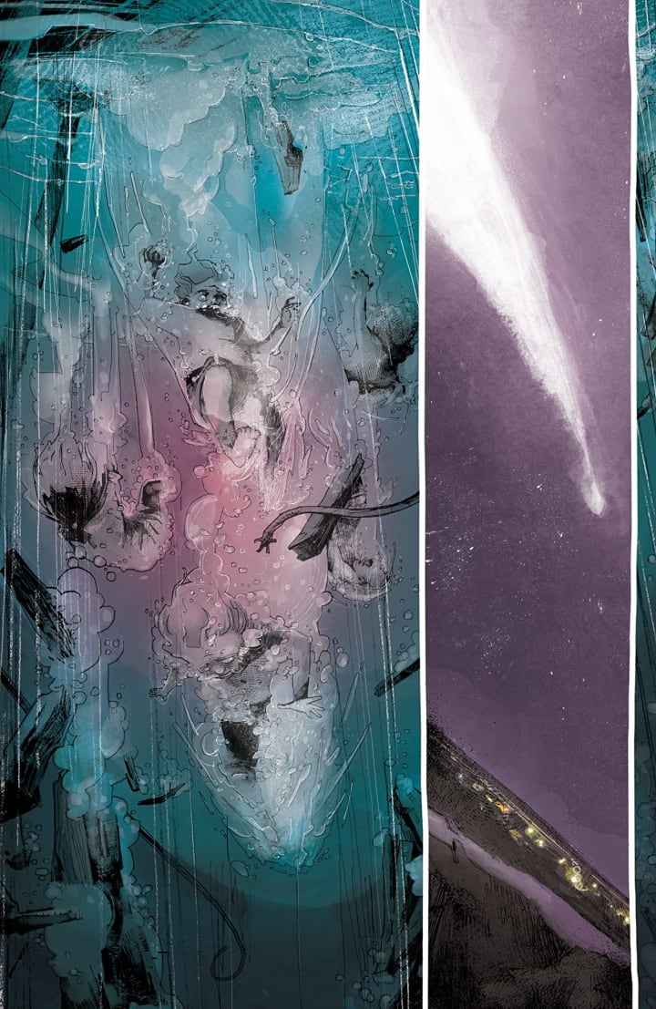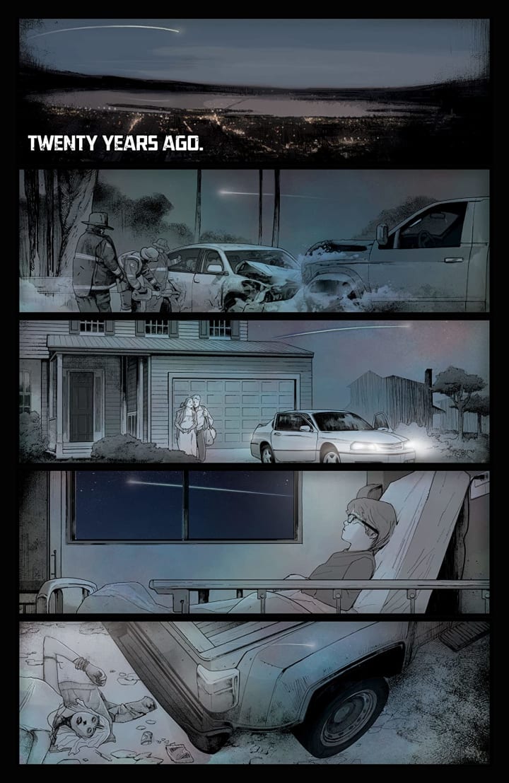 I love the way that this is being told. The story & plot development that we see through how the sequence of events unfold and how the reader learns information is presented exceptionally well. The opening, wordless, is almost ambiguous in what it represents though we know its the night that the comet fell to earth setting off the chain reaction. It does precisely what it is supposed to do and that’s capture our attention so that we want to see more. The entire issue has this series of events that unfold before us and leave us with so many questions that only time will tell if they get answered. The character development is interesting and while the dialogue is always good it’s really how we see the characters act and react to the situations and circumstances that really define who they are. The pacing is superb and as it takes us through the pages revealing the story and introducing us to the characters and this world we’re drawn into this like we’re in the horror film unable to act like we think we would.