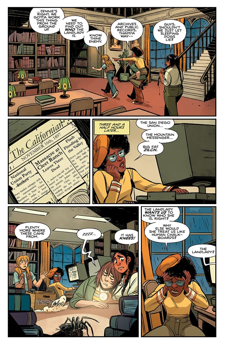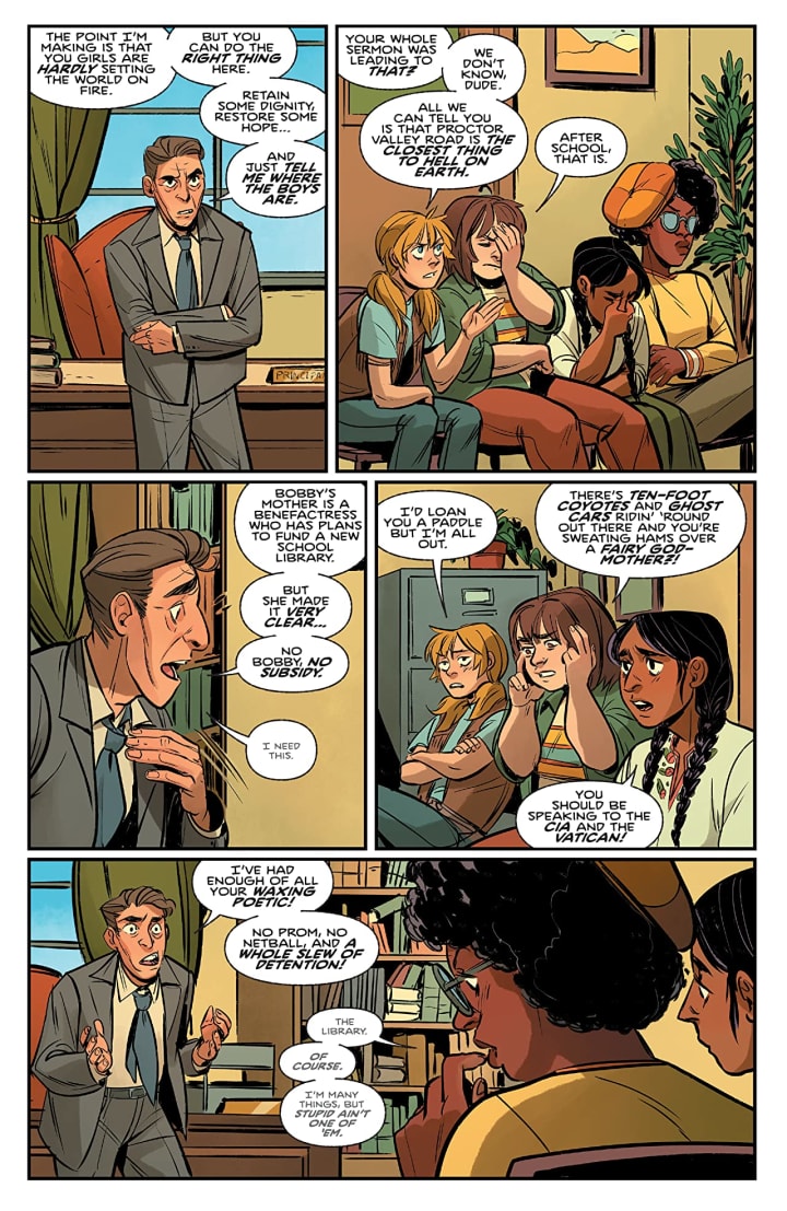 The all-ages interiors here are phenomenal in how they are totally misleading considering the nature of the story. The linework is beautifully rendered and how the varying weights are utilised to create the details work is sensational. I adore how each of them has their own unique look that completely suits their personality and that’s intentional which is so incredibly smart to do so that they are unique people and not generic teenage girls. The composition within the panels and how we see backgrounds really capture the depth perception, sense of scale and the overall sense of size and scope to the story. The utilisation of the page layouts and how we see the angles and perspective in the panels show a sensational eye for storytelling. The colour is fabulous and how the various hues and tones within the colours being utilised to create the shading, highlights and shadow work is incredibly well rendered.