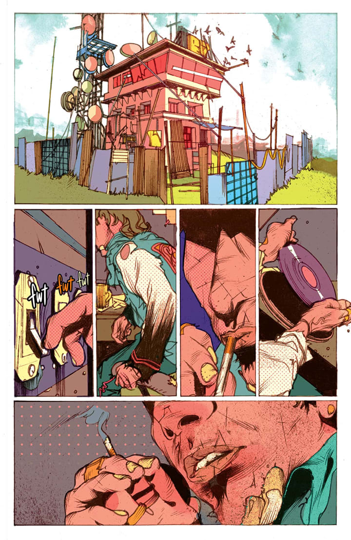 The interiors here are really rather interesting. The linework is strong, clean and crisp and with the varying weights and techniques being utilised to create this kind of detail within the work it’s rather extraordinary to see. Plus the unique style that we see captures the readers’ attention beautifully. The way that backgrounds are utilised to enhance and expand the moments as well as how they work within the composition of the panels to bring out the depth perception, sense of scale and the overall sense of size and scope to the story is marvellous to see. The utilisation of the page layouts and how we see the angles and perspective in the panels show a remarkably talented eye for storytelling. The various hues and tones within the colours being utilised to create the shading, highlights and shadow work show an exemplary eye for how colour works.