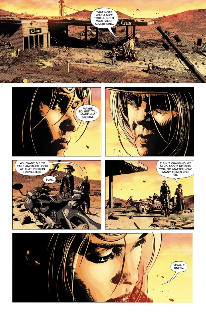 This is a truly engaging story, for example I wonder where they get cigarettes from, how this man whose so deathly afraid of The Butcher is able to rule with an iron fist and there are more instances but i’ll leave those up to you to decide on whats right for you and your mind. This is intelligently written with some outstanding interiors and it really makes all the difference int he world how this high quality work all around enables the reader to enjoy what’s being presented. I don’t ever want to know how the world got this way but I do want to know more about the characters who inhabit it and that’s the mark of great creators. Plus always leave them wanting more is a great motto as well.