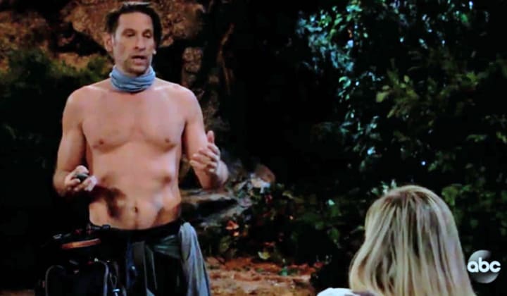 One mystery has been solved on GENERAL HOSPITAL but now there are more questions. Spoilers had teased that Roger Howarth would return as a new character and would be in some state of not fully dressed. On Thursday, he turned up in the woods where Maxie went into labor, announcing he was a doctor and delivered her baby. The only thing viewers know at this point is that his name is Austin.