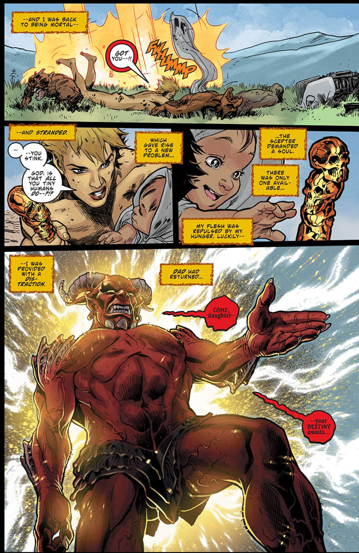 I love, love, love the interiors here. The linework is superb and it’s strong, clean and crisp and how it utilises the varying weights and techniques to create this level of detail work is astonishingly well rendered. Not gonna lie i’d like to see more backgrounds being utilised but all things being equal they are utilised well and enhance the moments along with bringing us depth perception, a sense of scale and the overall sense of size and scope to the story. The creativity and imagination that we see is fabulous and see Nyx’s dad is a complete wow moment. Then there’s Draculina and what she does with her visage is utterly amazing as well. The utilisation of the page layouts and how we see the angles and perspective in the panels show a stunningly talented eye for storytelling. The colour work is magical as well. How we see the various hues and tones within the colours being utilised to create the shading, highlights and shadow work shows a brilliant eye for how colour works.
