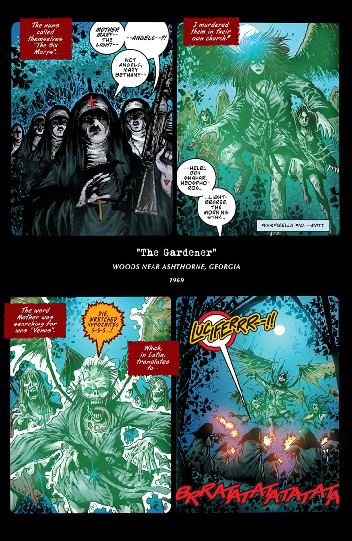 Our SIX newly-hired guns defend the peaceful vampires of Ashthorne from Chastity’s old flame, the merciless vampire slayer LEVITICUS. Meanwhile, Victory struggles to hide her newfound faith from the team and Vampirella is (literally) not quite herself. also, Nyx’s time-mashup adventure builds to a climax, but can she reclaim her hellfire scepter before her remaining life force expires?