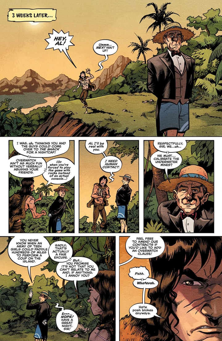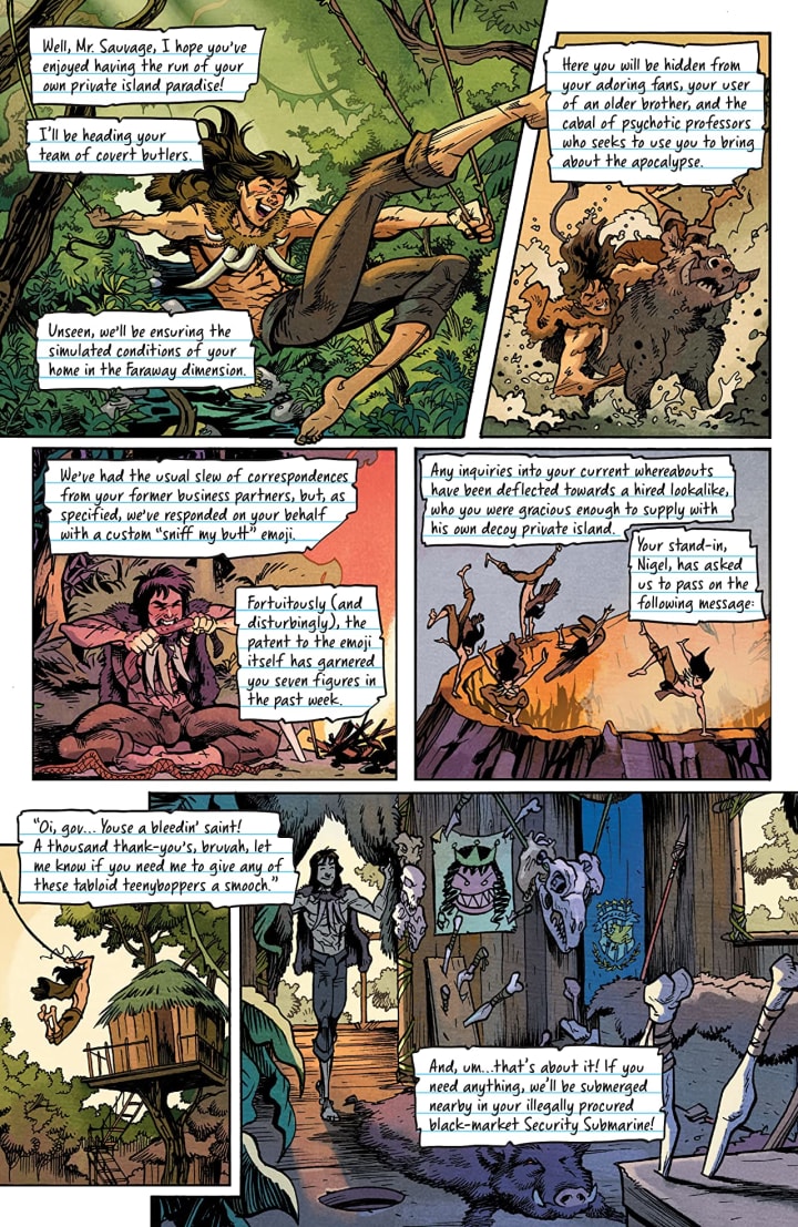 This is a crazy good time. I mean the whole dynamic that we see throughout the book is so good and so different and shouldn’t exactly work but it does and does it well. With his new home on an Island in the Tropics Savage feels more at home and alive than he’s ever been while in this reality even with Al, the butler. Meanwhile he knows that Project Bizarre has its own schemes going on but doesn’t really seem to care and has left his responsibilities completely. Though lets be honest if I had a brother like he does I’d run far, far away as well and let him get eaten by the dinosaurs that have been brought to this reality.
