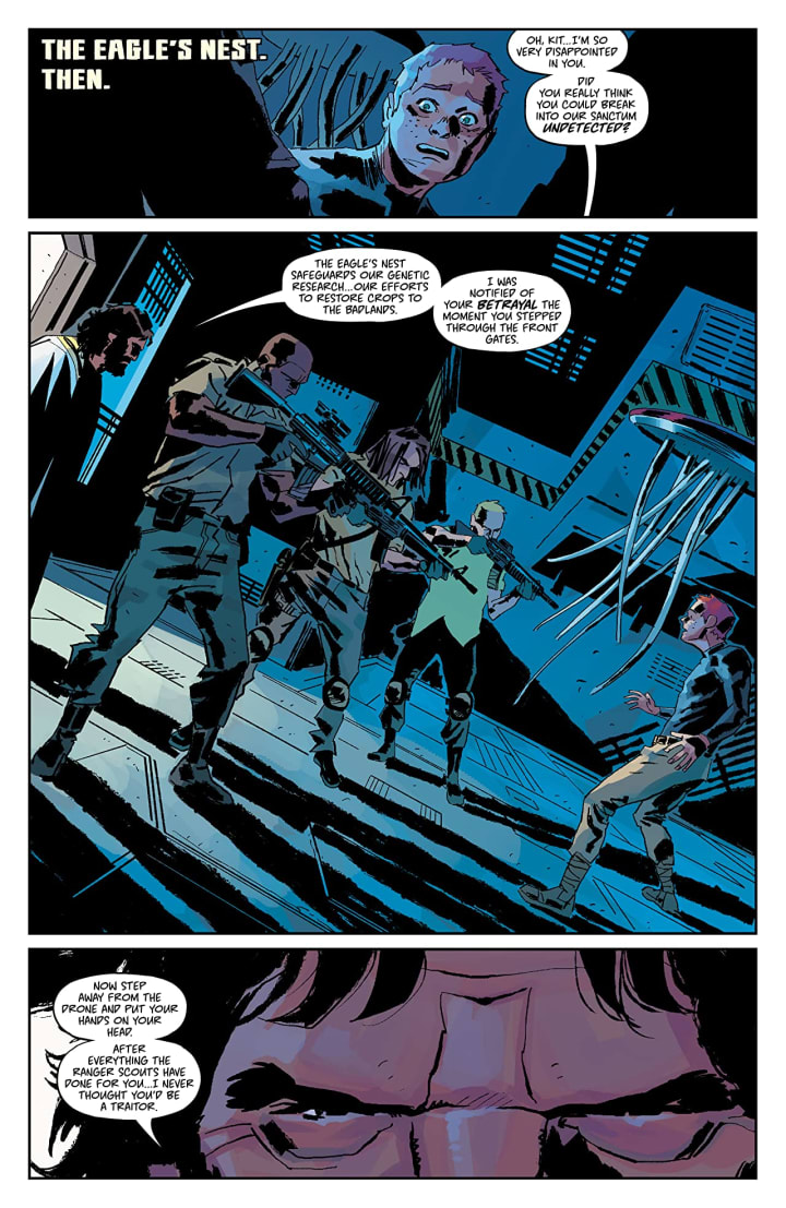 I am a huge fan of the way that this is being told. The story & plot development that we see through how we see the sequence of events unfold as well as how the reader learns information is presented exceptionally well. The fact that Kit is betrayed by her best friend as well as his father, who leads the Scouts, and yet refuses to take this sitting down really helps define who she is and to see the sequence in which all of this comes to pass is expertly done. The character development that we see here is absolutely phenomenal. From how we see the characters act and react to the situations and circumstances they encounter to the dialogue we see is how they are fleshed out as people. The pacing is superb and as it takes us through the pages blending action and story is says we’re in the presence of a writer on the verge of being one of the strongest.