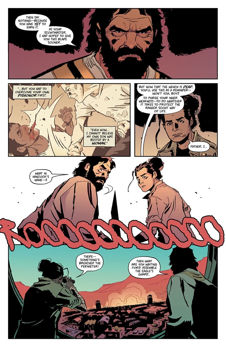 David really has emerged as one of today’s stronger writers and that he’s been able to create this world based off a single object, the Scout’s Guide book, and turned that into a religion which of course is how men are so easily swayed and controlled is mindbogglingly well done. Seriously this is a fully realised world and we’re visitors in it as David writes it in a way that makes the reader think, think of the book, think of using religion in various ways, think about sexism and so much more. This isn’t just a fun little post apocalyptic tale it’s so much more with this wide range of ideas happening within it. It is a modern day mini-epic and its just an outstanding story in every way it can be.