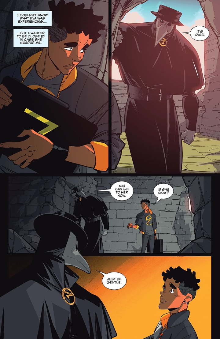 I like the all-ages style interiors here even though this is far from all-ages. It adds this endearing quality to the book that makes you want to like the characters all the more. The linework is strong, clean and crisp and how the varying weights and techniques are being utilised to create the detail work is amazingly well rendered. I love the fact that we see backgrounds being utilised as they really enhance the moments and how they work within the composition of the panels to bring out the depth perception, sense of scale and the overall sense of size and scope to the story. The utilisation of the page layouts and how we see the angles and perspective in the panels show a remarkably talented eye for storytelling. The colour work is brilliantly rendered. The various hues and tones within the colours being utilised to create the shading, highlights and shadow work is beautifully done. That harlequin inspired mask is utterly gorgeous no matter if its shining in the sun of in the shade because those colours really make it pop!